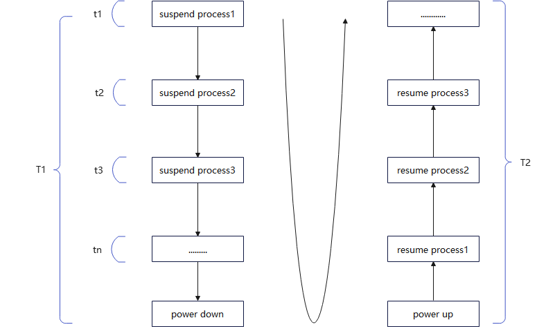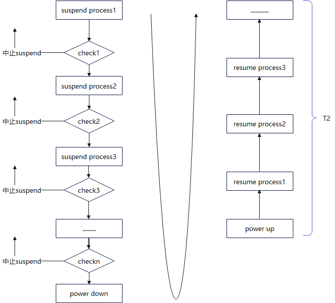 睡眠状态是通过唤醒中断唤醒的,我们无法预知唤醒中断什么时候可以唤醒,如果在睡眠过程中我们不做检查,那么有可能在过程中唤醒中断就到来了,这个时候睡眠继续往下走是没有意义的,空多了一次唤醒过程,如果我们能在睡眠流程中及时发下唤醒中断的到来并及时停止睡眠流程,那么就节省了一次睡眠唤醒时间。我们假设suspend流程耗时T1,resume流程耗时T2,那么经过一次睡眠唤醒耗费在流程上的总时长为T1+T2。试想一下,如果在处理完suspend process1后,在处理suspend process2之前,如果唤醒事件到来,其实本次suspend流程是没有必要继续走suspend process2之后的流程的,T1-t1+T2这段时间的处理纯属浪费,白白多花费了一次睡眠唤醒流程,也延迟了唤醒事件的处理速度。示意图如图19-6所示。