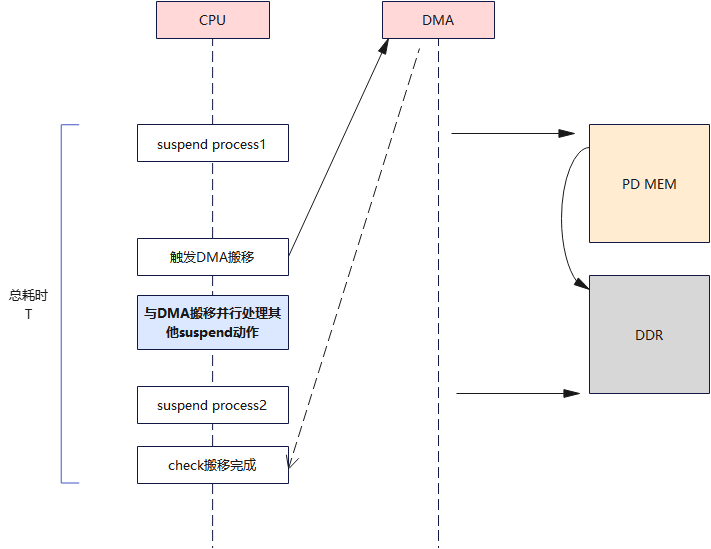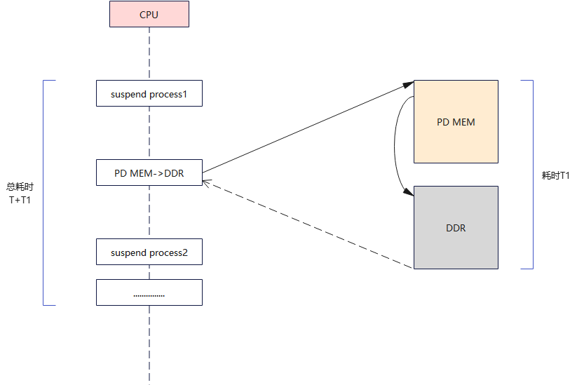在suspend流程中,PD MEM中的内容我们使用CPU来做下电前的保存动作,如图19-3所示,把内容保存到DDR中,耗时T1,其他suspend处理耗时为T,那么suspend总耗时为T+T1,T1时长与PD MEM的大小强相关,越大耗时越长。