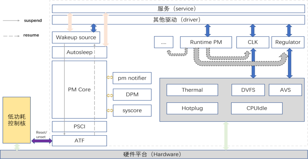 低功耗比较敏感的一个KPI是suspend和resume的时间,因为低功耗是系统中的一个常态,这一块的处理时间当然是越短越好,这样可以让用户体验更流畅。一个好的思想是让处理尽可能的并行起来,比如在suspend和resume的流程中,有一长段地址空间需要保存恢复,那么如果是用CPU的话,效率是十分低下的,这个时候我们可以使用DMA来搬移数据,同时CPU继续处理低功耗处理的其他流程,在合适的点来检查DMA的搬移状态。我们可以通过以下例子来说明。