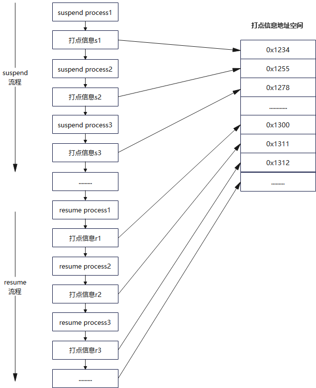 4)r1打点信息是0x1300,r2打点信息是0x1311,那么我们可以判定resume process2的处理耗时为0x1311-0x1300=0x11个时间单位,同样的原理我们可以算出整个resume流程的耗时时长。