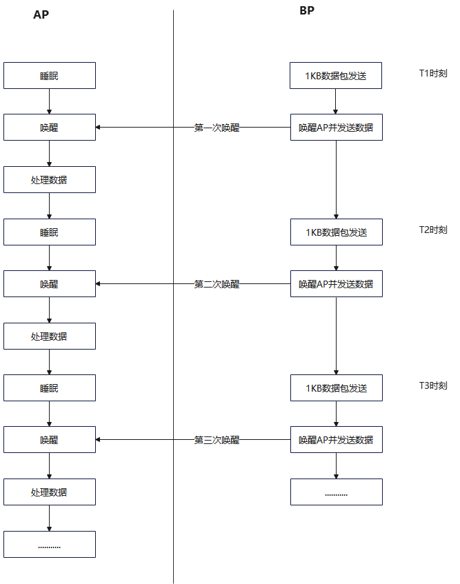 通过减少唤醒次数,可以显著的节省系统对功耗的消耗。比如BP要往AP发送数据,每次有数据到来都要对AP做一次唤醒动作,每次醒来大概率可能只是处理了这个数据而已,然后又睡下去,过段时间可能又有数据需要发送,然后又一次唤醒AP,每一次的唤醒都是对功耗和资源的消耗。如图19-10所示。 优化前: