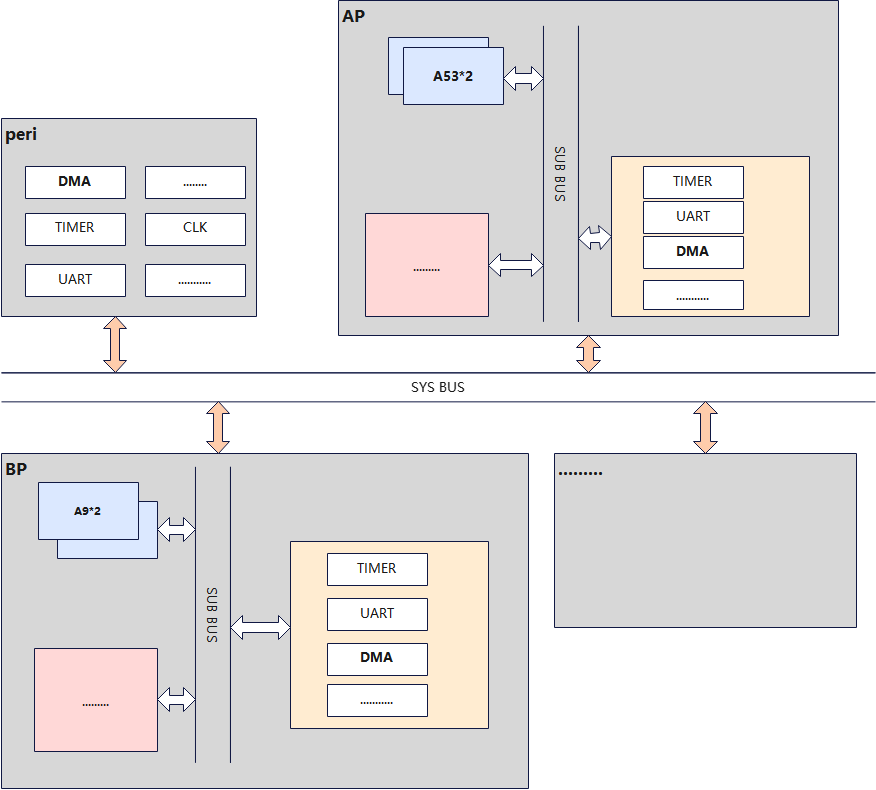 如BP需要访问DMA的话,那么它也需要先经过自己系统的SUB BUS总线,再通过SYS BUS总线访问到外设区的DMA;如此这般,其他子系统都是同样的访问路径。在这样的情况下,有2个缺点:一是访问路径过远增加了总线的繁忙程度,可能导致访问延时﹔二是可能存在资源竞争的发生,比如AP、BP或其他子系统同时访问的话,可能需要做仲裁处理。
