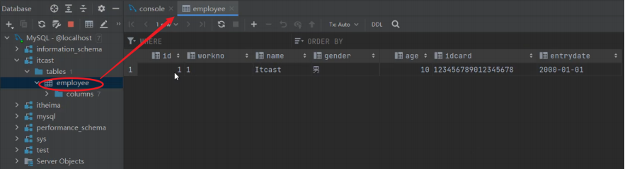values(1,'1','Itcast','男',10,'123456789012345678','2000-01-01');插入数据完成之后,我们有两种方式,查询数据库的数据: