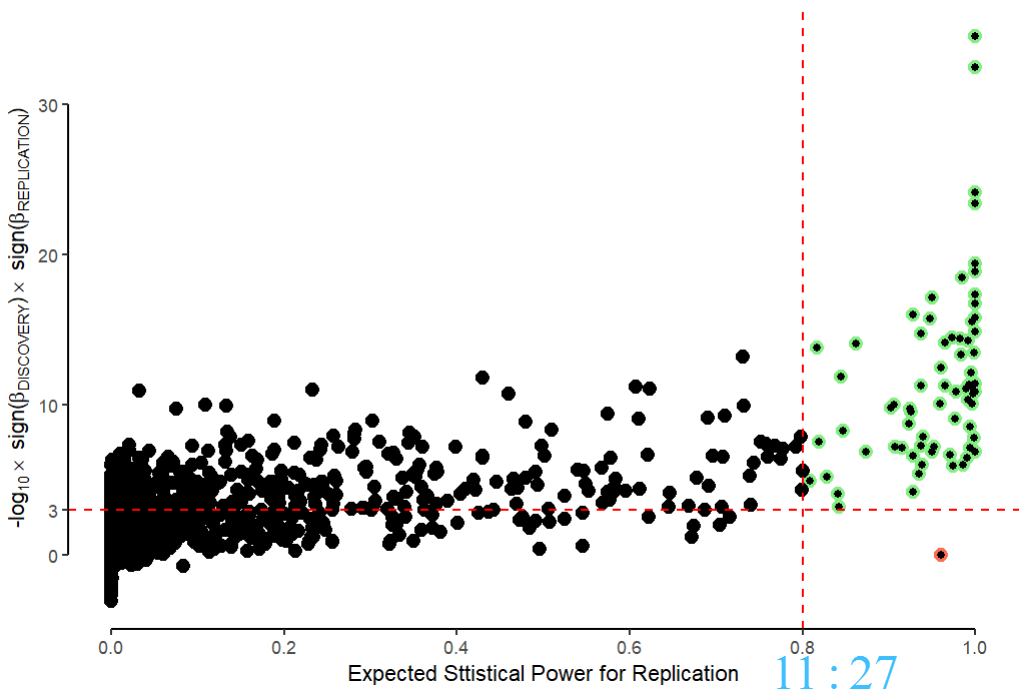 y=TeX(r"(-log${_1}{_0}$\times sign(\beta$_{DISCOVERY}$)\times sign(\beta$_{REPLICATION}$))"))