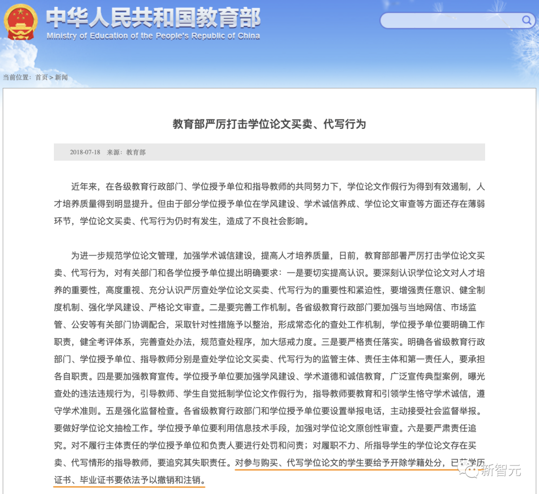 教育部也曾在2018年7月发文,特地强调了要「严厉打击学位论文买卖、代写行为」。