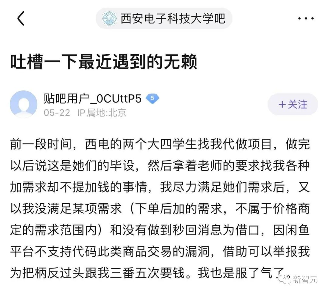 今年5月,一位「枪手」在西电贴吧发帖,举报论文买主敲诈且学术不端。