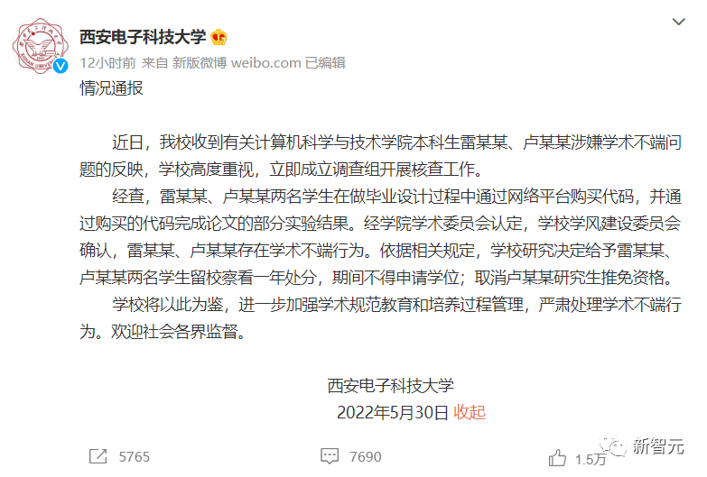 而在5月31日,西安电子科技大学宣布了该事件的处理结果:涉事两人留校察看、延毕一年,原定保研者取消保研资格。