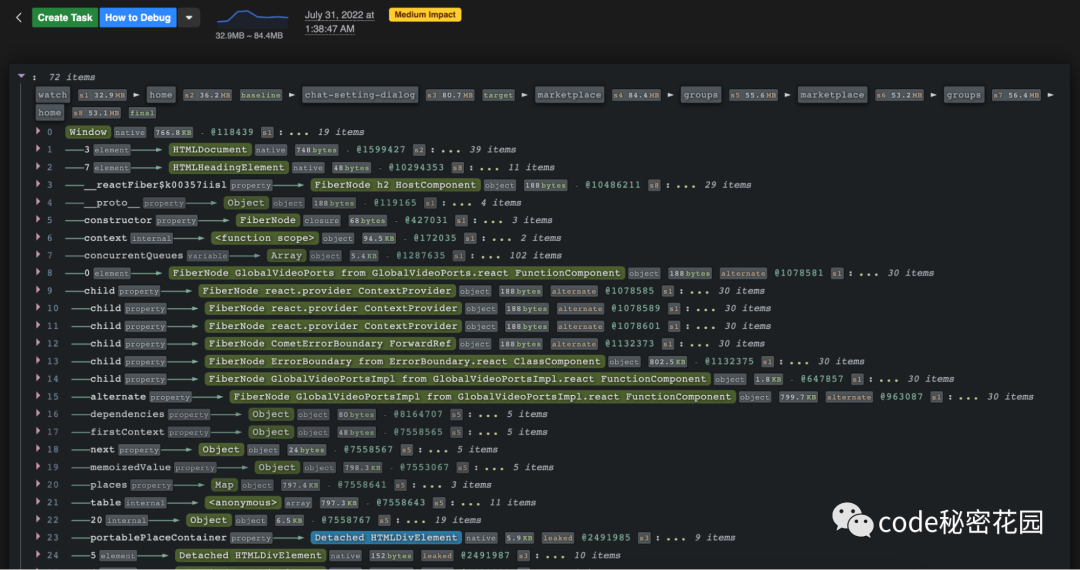 MemLab 使用 Puppeteer 自动化浏览器,在目标页面上查找泄露的对象;MemLab 通过区分 JavaScript 堆并记录在页面 B 上分配的一组对象,这些对象没有在页面 A 上分配,但在重新加载页面 A 时仍然存在,从而发现潜在的内存泄漏;React 分配的 Fiber 节点(React 用于渲染虚拟 DOM 的内部数据结构)应该在我们访问多个选项卡后清理时释放。retainer traces 。trace 显示了泄漏对象为何以及如何在内存中保持活动状态。打破引用链意味着泄漏的对象将不再可以从 GC 的根访问,因此可以进行垃圾回收。通过一步步地跟踪,就可以找到应该设置为 null 的引用;retainer traces 聚集在一起,并为每个共享相似 retainer traces 的泄漏对象聚合显示为一个跟踪,其中还包括调试信息,例如支配节点和保留大小。MemLab,以持续收集 retainer traces,任何新的 traces 都会记录到内部仪表板,开发者可以查看每个内存泄漏的 retainer traces 上的对象属性。「内存泄漏检测」