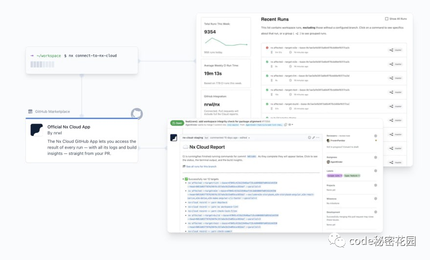 远程缓存允许你将本地缓存分发给你的同事和CI系统。它通过 Nx Cloud 完成的,但分布式缓存只是一个方面。Nx Cloud 还提供了一个“运行视图”,可以可视化你的 CI 运行,具有简单的分组和过滤功能,它具有跨多台机器动态分配任务的能力。所有这些都是通过优化最佳的并行化和机器利用率实现的。
