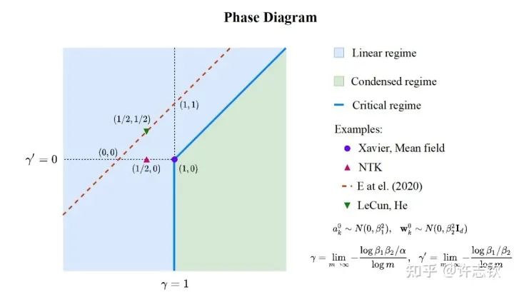 前面,我们只是通过一个简单的例子来呈现凝聚现象,接下来重要的问题是:参数凝聚是非线性过程中普遍的现象吗? 在统计力学相图的启发下,我们在实验发现并理论推导出了两层无限宽ReLU神经网络的相图。基于不同的初始化尺度,以参数在训练前后的相对距离在无限宽极限下趋于零、常数、无穷作为判据,相图划分了线性、临界、凝聚三种动力学态(dynamical regime)。领域内的一系列理论研究(包括NTK,mean-field等)都可以在我们的相图中找到对应的位置[3]。