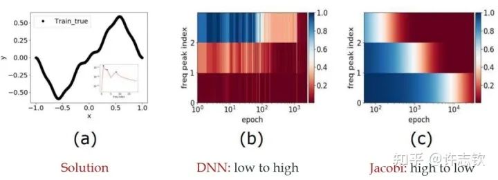 我早期在汇报频率原则相关的工作的时候,做计算数学的老师同学非常有兴趣,因为在传统的迭代格式中,例如Jacobi迭代,低频是收敛得非常慢的。多重网格方法非常有效地解决了这个问题。我们在实验中,也验证了神经网络和Jacobi迭代在解PDE时完全不一样的频率收敛顺序(如下图)[2, 5]。