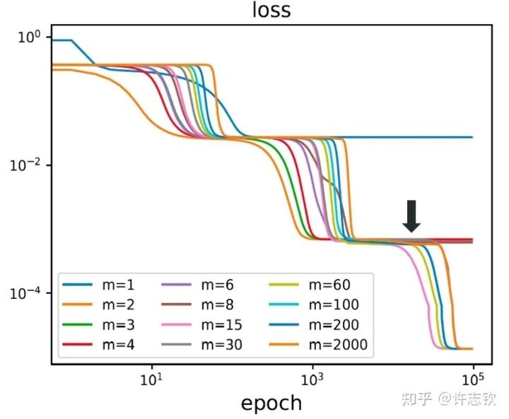 嵌入原则揭示了不同宽度网络的相似性,当然也提供了研究它们差异性的手段。由于在嵌入的过程中有自由参数,因此在更大网络的临界点的退化程度越大。同样的,一个大网络的损失景观里的临界点,如果它来源于更简单的网络的临界点的嵌入,那么它的退化程度也越大(直观可以理解它占的空间越大)。我们就可以猜测这些越简单的临界点越有可能被学习到。