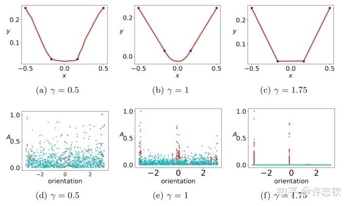 对于ReLU激活函数,我们可以通过考虑输入权重的角度和神经元的幅度来理解每个神经元的特征:, 其中 。考虑用上面的两层神经网络来拟合四个一维的数据点。结合输入权重和偏置项,我们所关心的方向就是两维的方向,因此可以用角度来表示其方向。下图展示了,不同初始化下,神经网络的拟合结果(第一行),以及在训练前(青色)和训练后(红色)特征分布的图(第二行)
