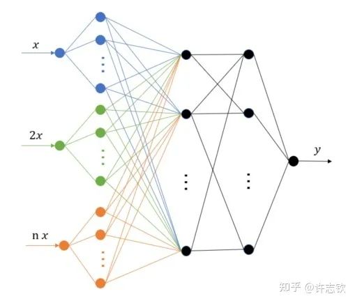 除了理解,频率原则能对我们实际设计和使用神经网络产生什么指导吗?频率原则揭示了神经网络中存在高频灾难,这也引起了很多研究人员的注意,包括求解PDE、生成图像、拟合函数等。高频灾难带来的训练和泛化困难很难通过简单的调参来缓解。我们组提出了多尺度神经网络的方法来加速高频的收敛[11]。基本的想法是把目标函数在径向进行不同尺度的拉伸,尝试将不同频率的成分都拉伸成一致的低频,达到一致的快速收敛。实现也是非常之容易,仅需在第一隐藏层的神经元的输入乘以一些固定的系数即可。我们的一些工作发现调整激活函数对网络的性能影响很大[12],用正弦余弦函数做第一个隐藏层的基可以有比较好的效果[13]。这个算法被华为的MindSpore所采用。径向拉伸的想法在很多其它的算法中也被采用,包括在图片渲染中非常出名的NerF(神经辐射场)。