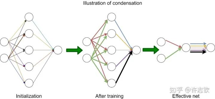 显然,随初始化尺度变小(从左到右,初始化尺度不断变小),神经网络的拟合结果差异很大,在特征分布上,当尺度很大(这里使用NTK的初始化),神经网络特征几乎不变,和random feature这类线性模型差不多,而随初始化变小,训练过程出现明显的特征变化的过程。最有意思的是,这些特征的方向聚集在两个主要的方向。我们把这种现象称为参数凝聚。 大量的实际问题告诉我们神经网络比线性的方法要好很多,那非线性过程所呈现的参数凝聚有什么好处吗? 如下图展示的一个极端凝聚的例子,对于一个随机初始化的网络,经过短暂的训练后,每个隐藏层神经元的输入权重是完全一致的,因此这个网络可以等效成仅有一个隐藏层神经元的小网络。一般情况下,神经元会凝聚到多个方向。