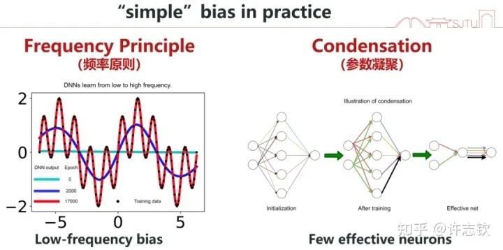 在学习与训练神经网络的过程中,我们很容易发现,神经网络的训练有一定的规律。在我们的研究中,有两种现象很有趣,在研究和解释它们的过程中,我们发现它们同样是很有意义的。我先简单介绍,然后再详细分别介绍。第一,我们发现神经网络在拟合数据的过程中经常会先学习低频,而后慢慢学习高频。我们把这个现象命名为频率原则(Frequency Principle, F-Principle)[1, 2],也有其它工作把它称为Spectral bias。第二,我们发现在训练过程,有很多神经元的输入权重(向量)的方向会保持一致。我们称之为凝聚现象。这些输入权重一样的神经元对输入的处理是一样的,那它们就可以简化成一个神经元,也就是一个大网络可以简化成小网络[3, 4]。这两种现象都体现神经网络在训练过程中有一种隐式的简单偏好,低频偏好或者有效小网络偏好。低频偏好是非常普遍的,但小网络偏好是要在非线性的训练过程中才会出现的特征。