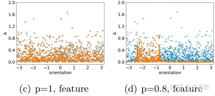 仔细看他们的特征分布时,可以看到训练前(蓝色)和训练后(橙色)的分布在有Dropout的情况下会明显不同,且呈现出明显地凝聚效应,有效参数变得更少,函数复杂度也相应变得简单光滑。