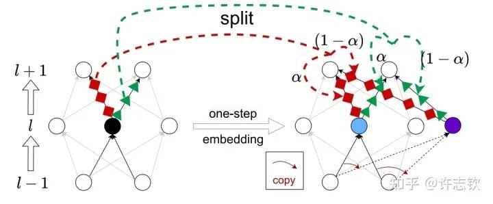 我们证明了不同宽度的网络的损失景观的极值点存在一个嵌入原则(Embedding Principle)[16], 即一个神经网络的损失景观中 “包含”所有更窄神经网络损失景观的所有临界点(包括鞍点、局部最优点和全局最优点等)。简单地说,就是一个网络处理临界点时,通过一些特定的嵌入方式,可以把这个网络嵌入到一个更宽的网络中,嵌入过程能够保持网络输出不变以及宽网络仍然处于临界点。最简单的嵌入方式正是凝聚的逆过程,比如下图是一种一步嵌入方式。更一般的嵌入方式我们在Journal of Machine Learning第一期的文章里[17]有详细讨论。