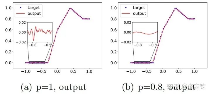 在三层无穷宽[15]的全连接网络中,我们实验证明在所有非线性的区域,参数凝聚都是一种普遍的现象。理论上,我们证明当初始化尺度足够小的时候,在训练初始阶段就会产生凝聚[4] 。有趣的是,我们在研究Dropout算法的隐式正则化的时候,发现Dropout算法会明显地促进参数凝聚地形成。 Dropout算法的想法是Hinton提出的,在神经网络的训练中,以一定概率p保留神经元,是一种常用的技巧,对泛化能力的提升有明显的帮助。我们首先来看一下拟合结果。下面左图是没有用Dropout的例子,放大拟合的函数,可以看到明显的小尺度的波动,右图是用了Dropout的结果,拟合的函数要光滑很多。