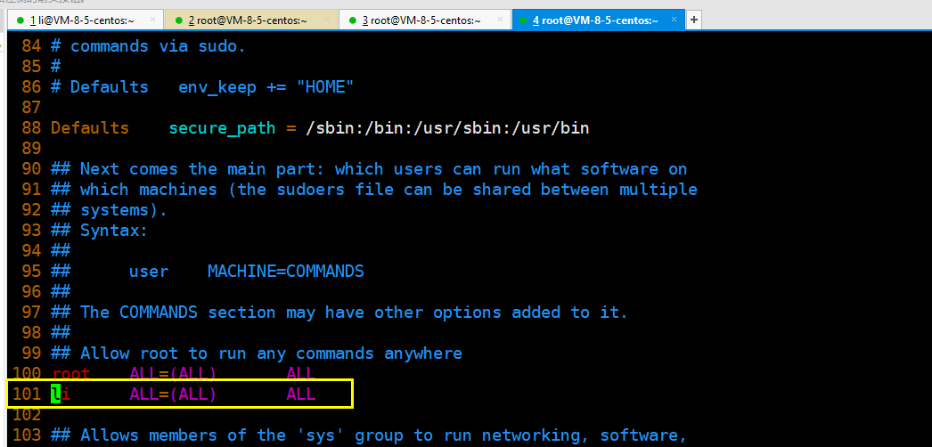 root用户下, 在/etc/sudoers文件中, 100+shift+g,添加一行相关信息即可!