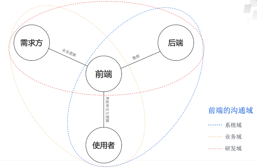 上图中,我们描述了前端开发者在整个业务开发过程中所处的境地。黑色圆圈表示在这过程中出现的角色,黑色实线表示与前端沟通时两个角色的联系,虚线圈表示当问题发生时参与该问题讨论的相关角色和内容。可以看到,前端开发者在与不同的角色进行沟通时,常常需要切换思维和角度,他所要面临的问题,所处的境地,如果没有一套方法论支撑,很难在繁杂的工作中不迷失。
