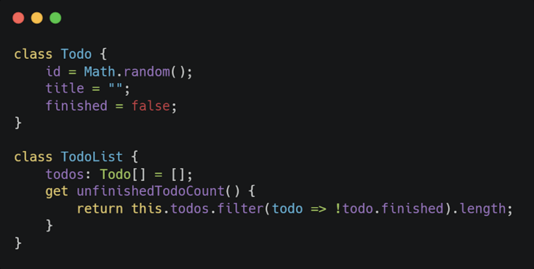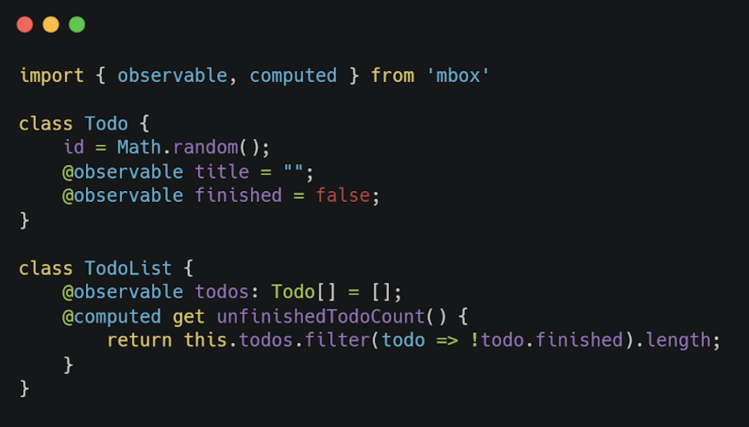 上图中,我们创建了两个模型Todo和TodoList,其中TodoList是对Todo的聚合,我们会在下文讲。这是两个再普通不过的class进行建模,现在的问题是:如果我们在前端使用这两个模型,我们无法与我们已有的UI框架配合使用,比如在react中或vue中使用。有没有一种方法,可以让我们可以以最小的代价扩展模型的能力呢?我们使用mobx这个库对模型进行改造。