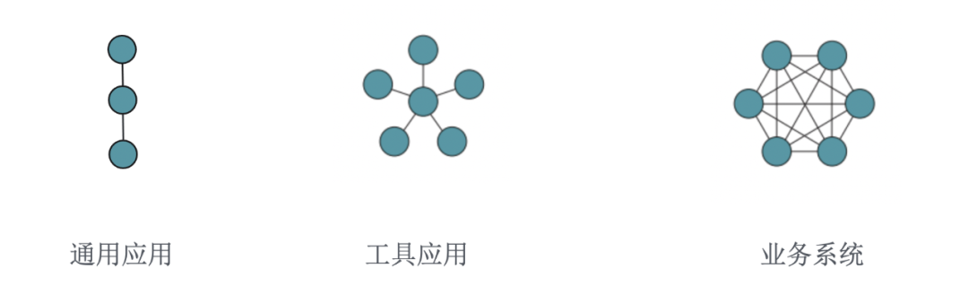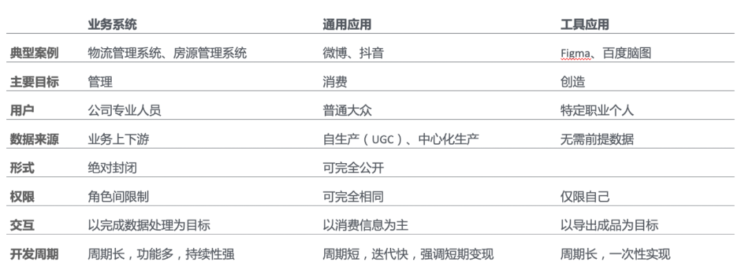 图2 业务系统、通用应用和工具类应用开发时解决问题的思路对比