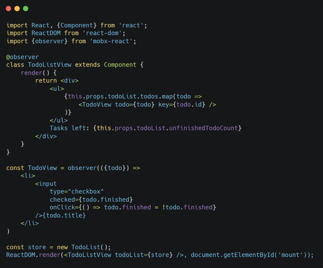 使用mobx提供的装饰器,我们以最少的改动增强模型。这一改动几乎不会对原始模型的原有阅读产生任何干扰,但却使得该模型是可被观察的。再配合mobx的工具,就可以与UI框架配合,就可以在应用中无缝对接。