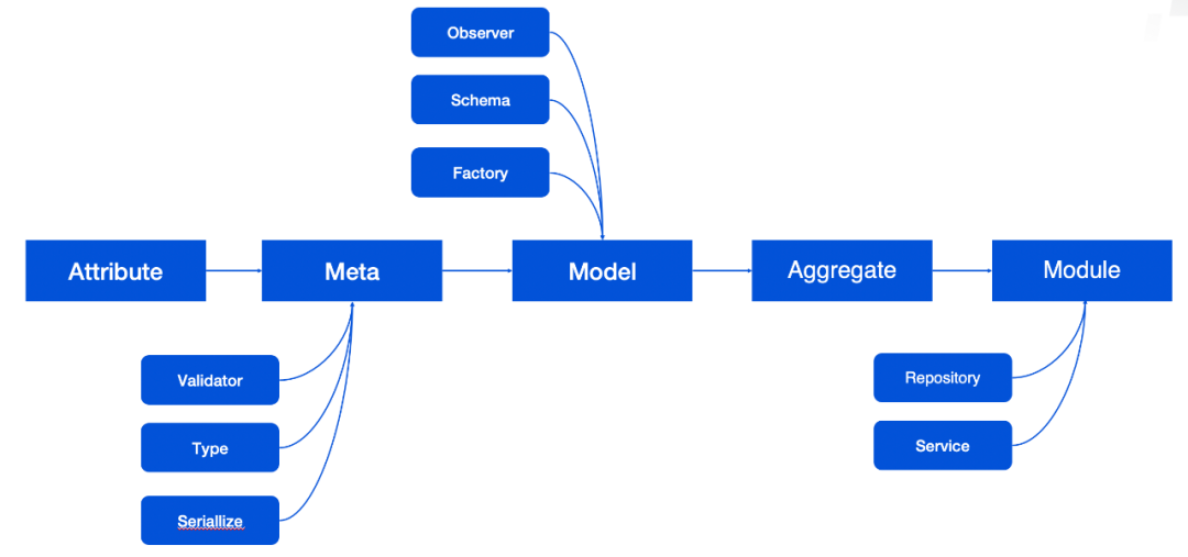在上图中,完整呈现了我们在代码层面实现领域模型的所有素材。建模的最小单位是Attribute即原子属性。原子属性描述一个字段(Field)或属性(Property)的具体属性,即元数据中的某一项。Meta是最小的模型,由Attribute组成,即关于单个字段的模型。Attribute和Meta不单独存在,它们是颗粒度最小的素材,Attribute一般不可复用(或者说没必要),Meta可限制性复用。