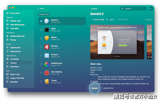 为了让你的Mac生活更有序,你得到了一个很酷的Uninstaller和Updater二重奏。第一个完全删除你不想要的应用程序,第二个,立即更新你的所有软件。糟糕的应用程序被完全删除,新的应用程序总是及时到达。这有助于解决软件冲突,让您的Mac永远年轻。
