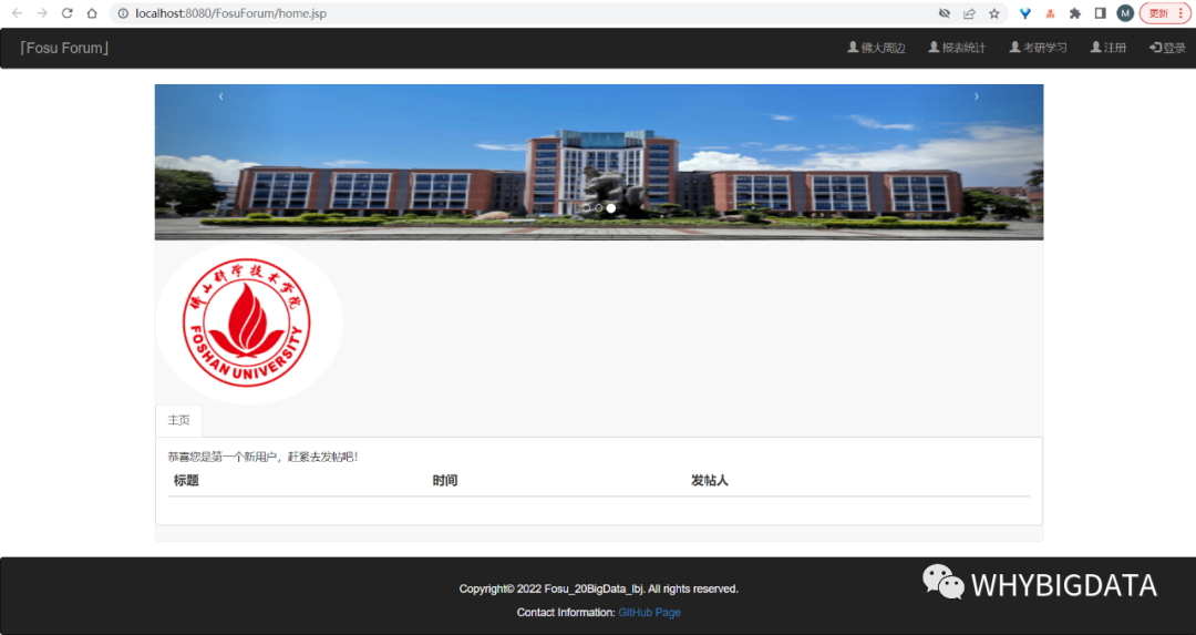 启动当前项目的Tomcat服务器,打开Google Chrome浏览器进行测试,在其地址栏中输入:http://localhost:8080/FosuForum(其中localhost为本地主机IP地址,8080为Tomcat服务器端口号,FosuForum是项目名称)按回车即可进入Fosu校园论坛首页界面。
