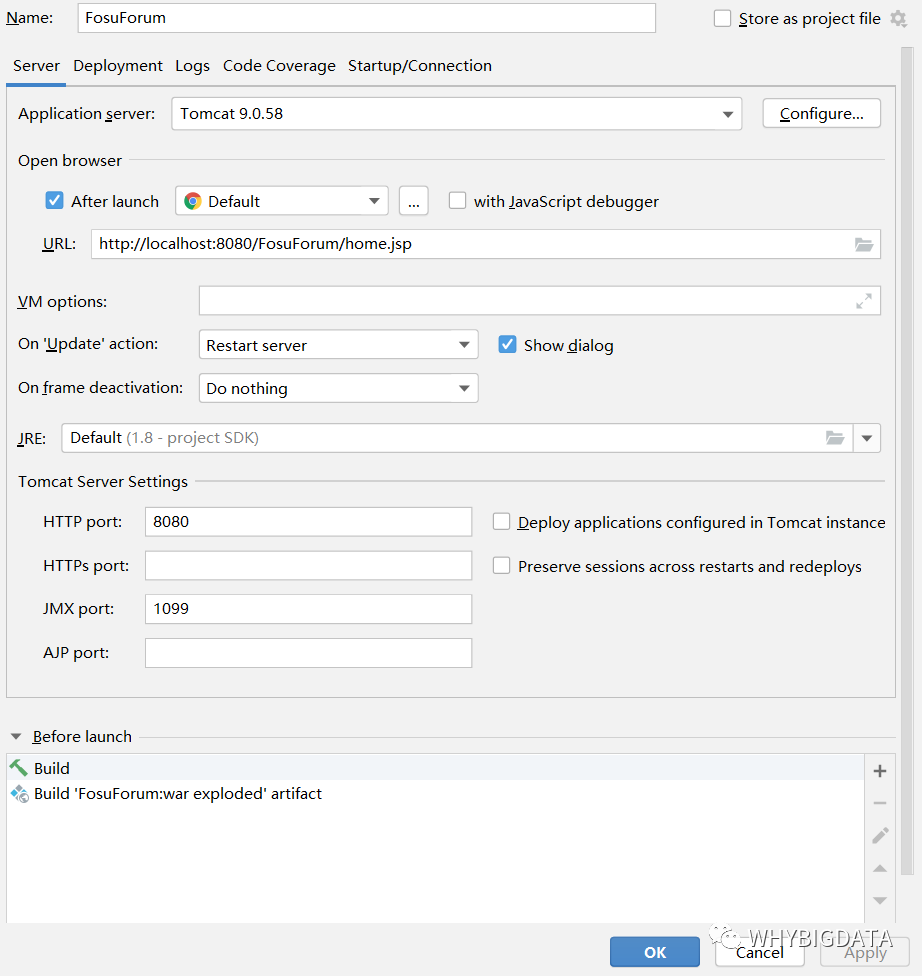 一栏,设置项目启动的URL为:http://localhost:8080/FosuForum/home.jsp,再依次点击Apply、OK按钮,此时Tomcat服务环境已经配置成功。如下图所示: