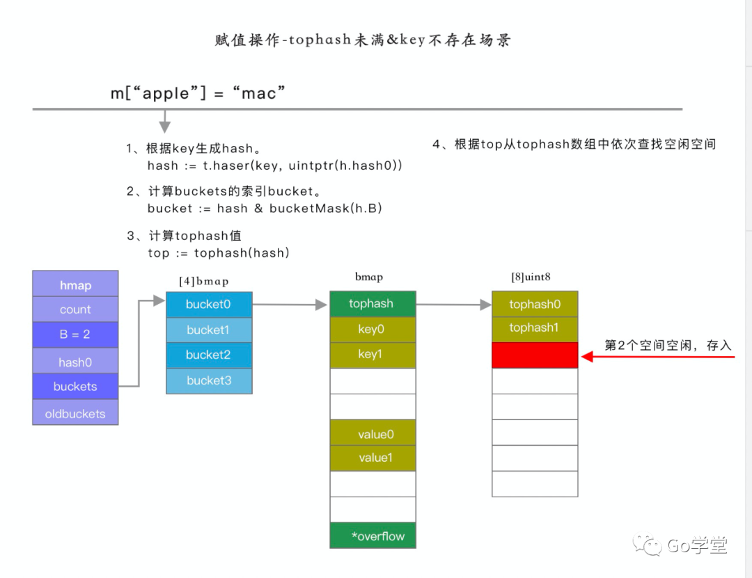 m['apple'] = 'mac'赋值操作的目标,是将 apple 经过 hash 之后,找到对应的 bucket,并存储到 bmap 结构体中。