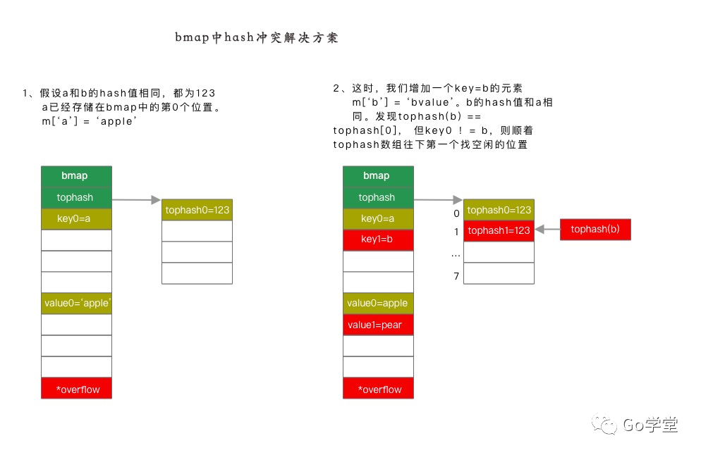 由上面的赋值操作可知,当遇到 hash 冲突的时候,go 的解决方法是先在 tophash 的数组中查找空闲的位置,如果有空闲的位置则存入。如果没有空闲位置,则在 bmap 的 bucket 指针的 tophash 中继续查,依次循环,直到找不等于该 key 的空闲位置,依次循环,直到从 tophash 中找到一个空闲位置为止。