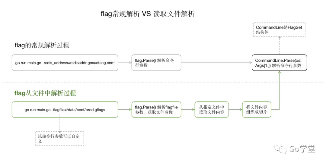 那我们要实现的目标实际上就是将文件中的每一行读取出来,组织成CommandLine.Parse函数可接收的参数即可。如下图所示flag常规解析和读取文件方式的示意图: