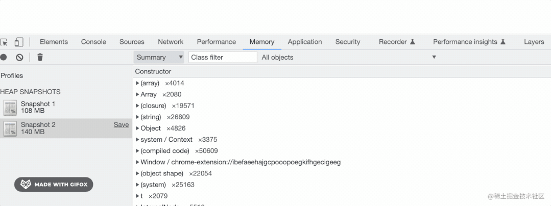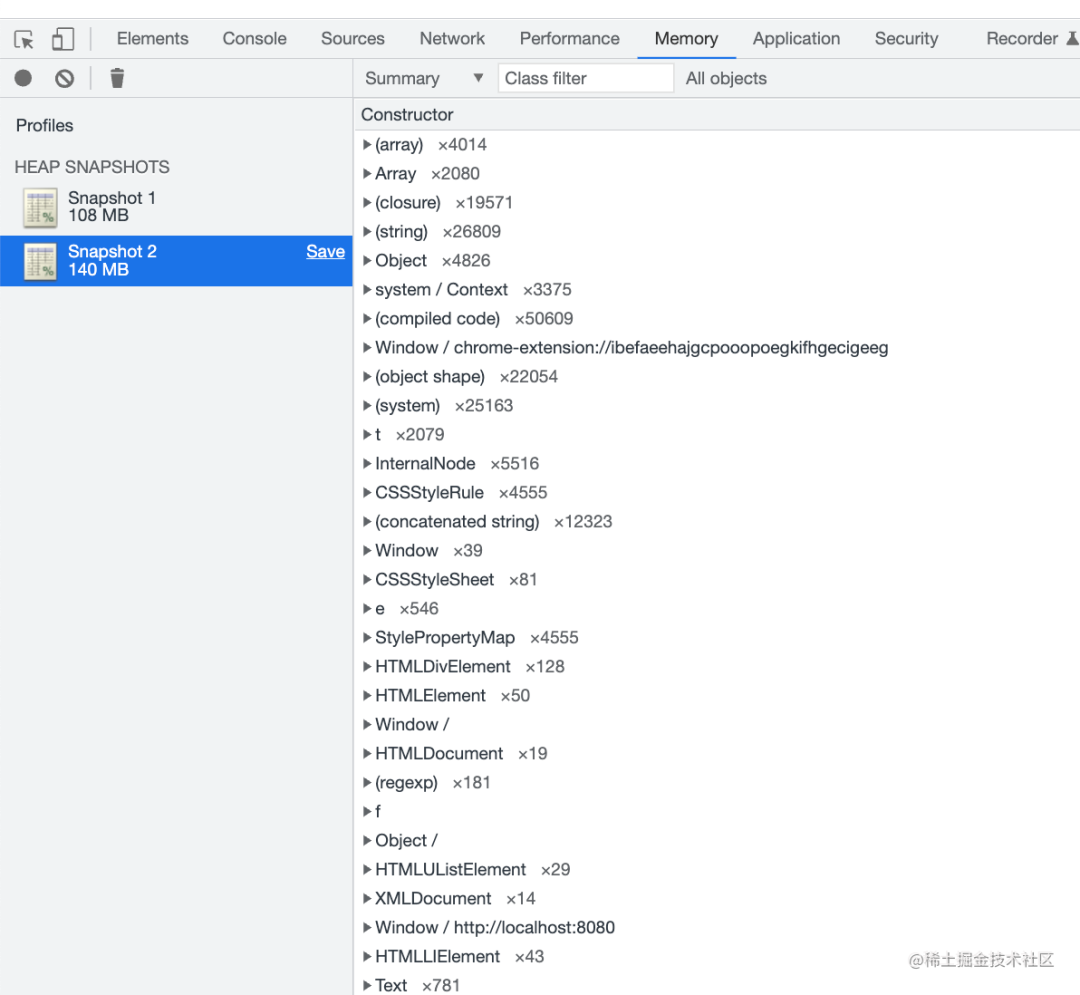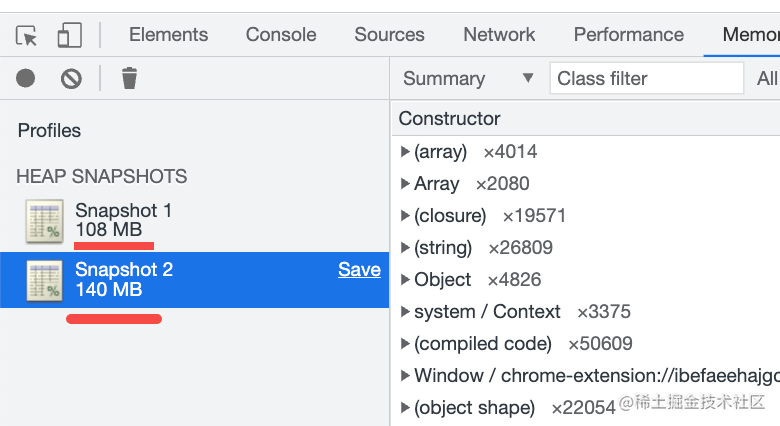 拿到两次内存快照也是可以分析出有内存泄漏的: