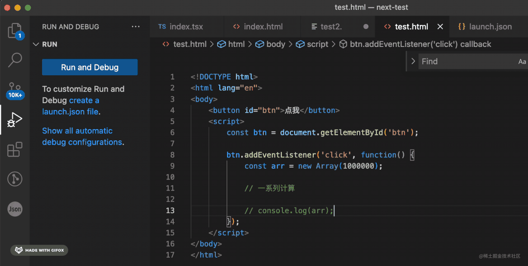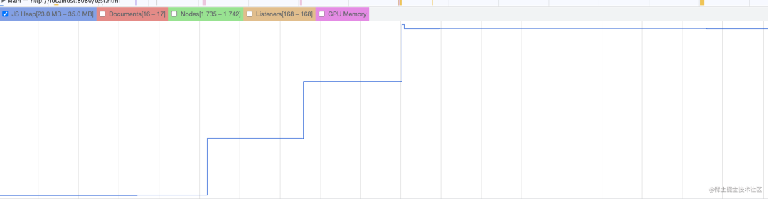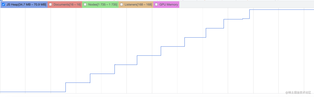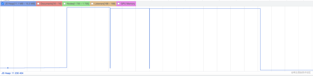 除了最开始全局变量会分配一些内存以外,点击按钮之后的内存变蓝后又变灰了,也就是被 GC 了。
