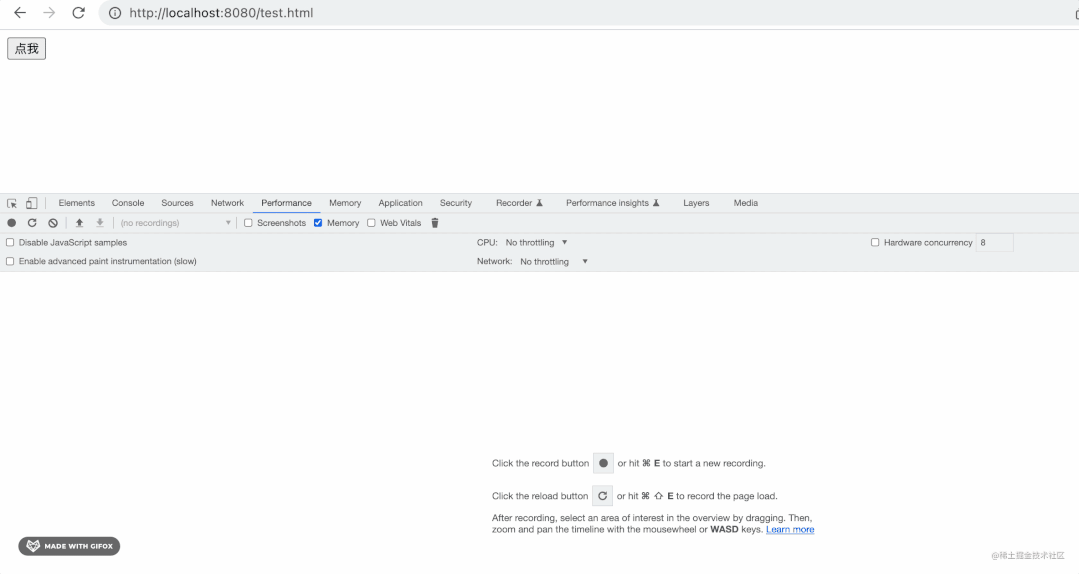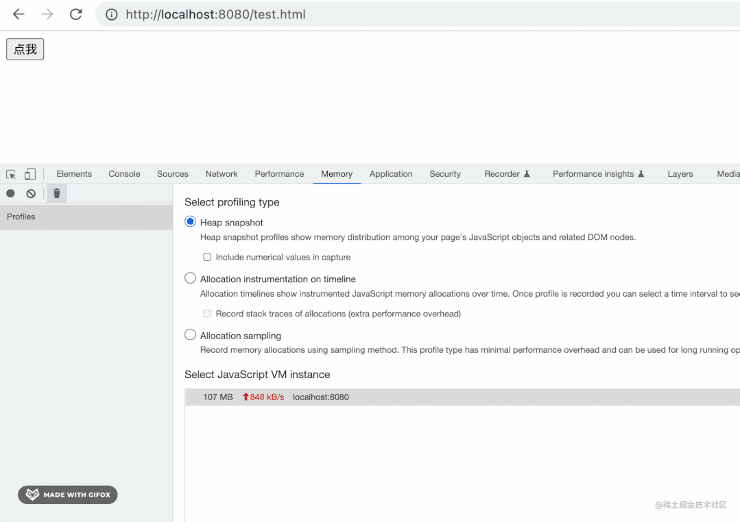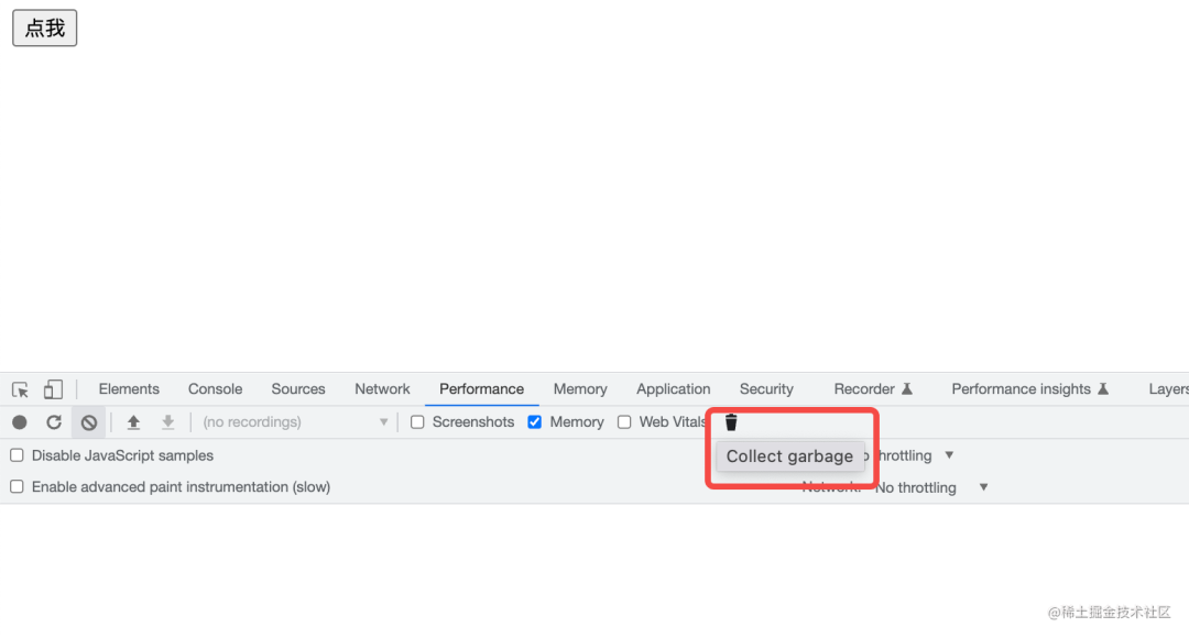点击 performance 下的垃圾回收按钮,手动触发一次 GC: