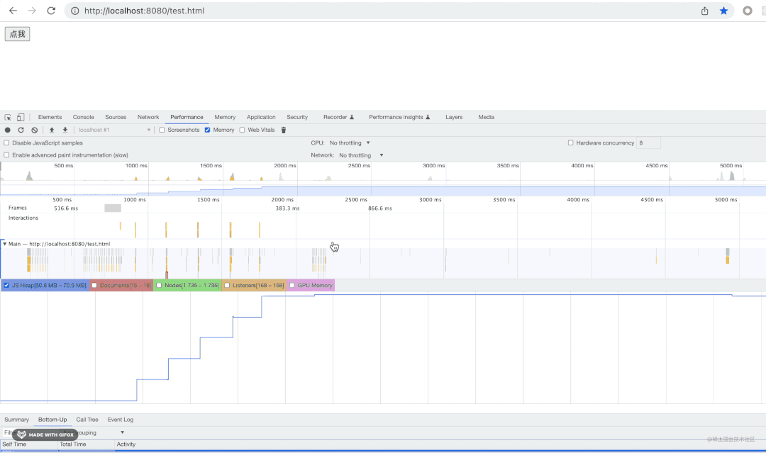 点击内存分配情况的某个点,就会定位到 performance 中的某个任务的代码,点击可以在下面看到详情: