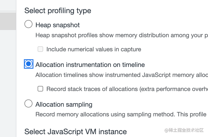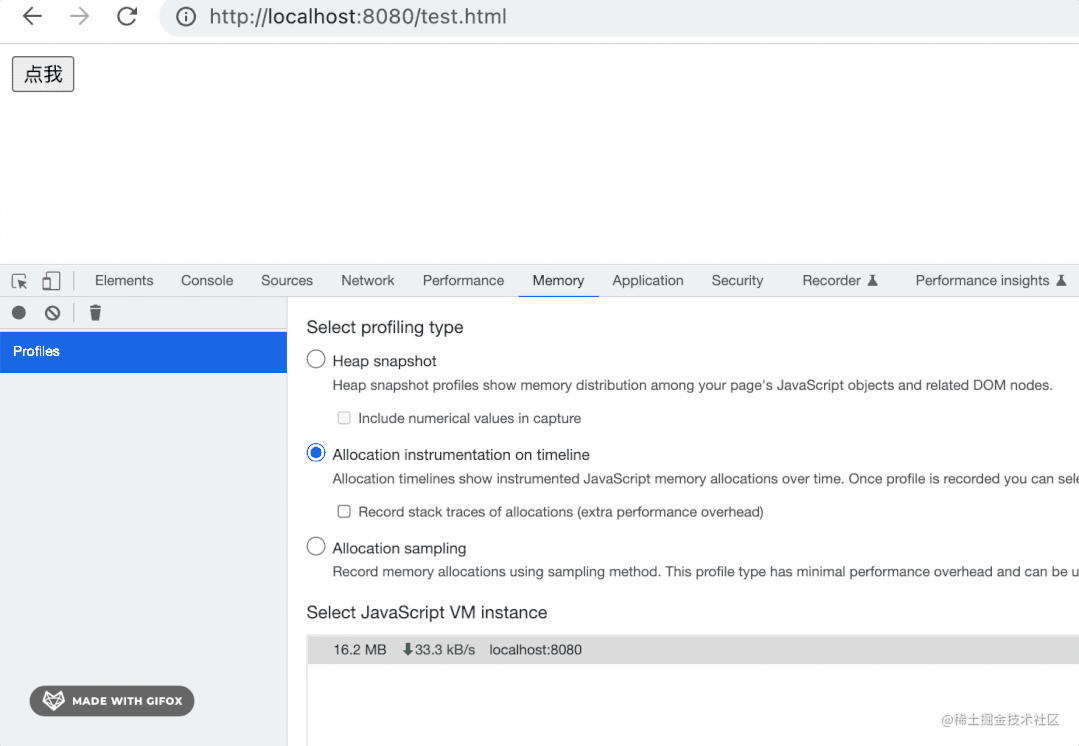 勾选 Memory,然后开始录制,点击 3 次按钮,再执行一次 GC: