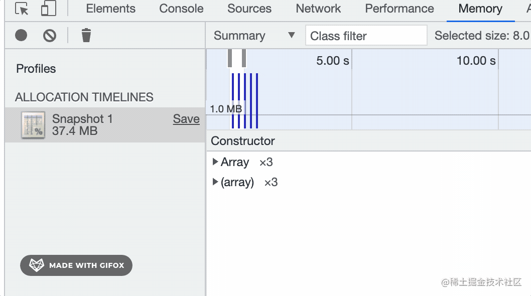内存占用有三次增长,因为我们点击三次按钮的时候会创建 3 次大数组。