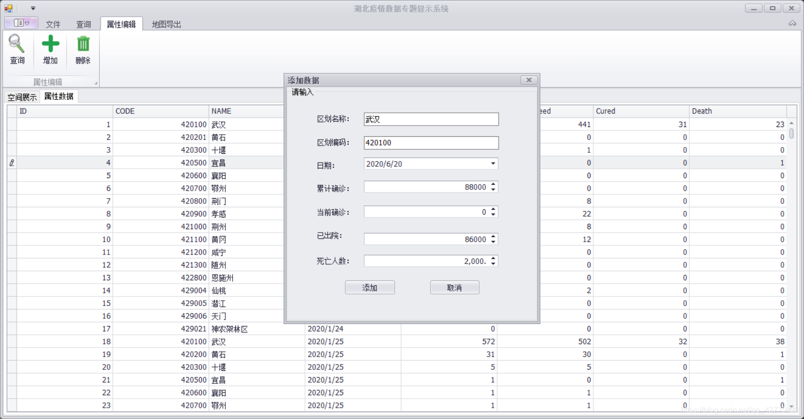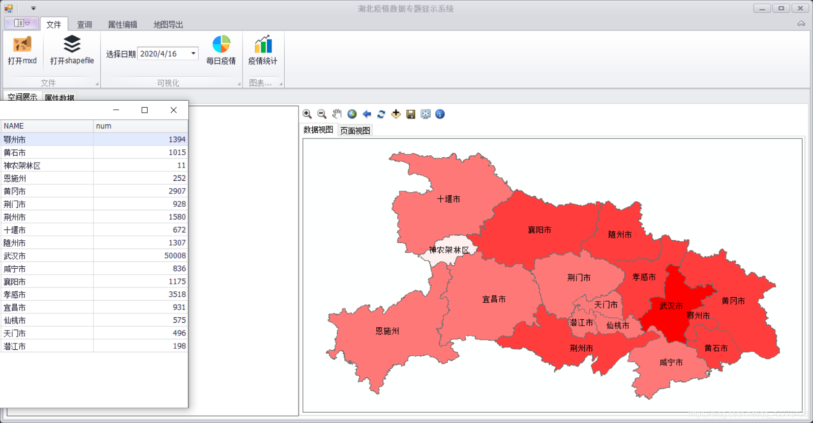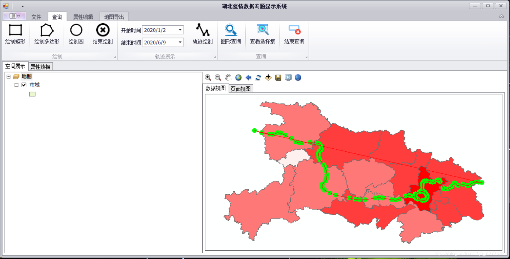 本系统基于ArcEngine 10.7 进行开发,使用了DevExpress作为界面控件,支持武汉疫情地图根据不同日期的展示、操作以及添加图例、导出为多种格式,支持属性数据的编辑和查询,支持指定时间区段统计疫情与轨迹分析功能;可以直观地展示出疫情的发展态势,为疫情分析和防控工作作出更好的决策参考。