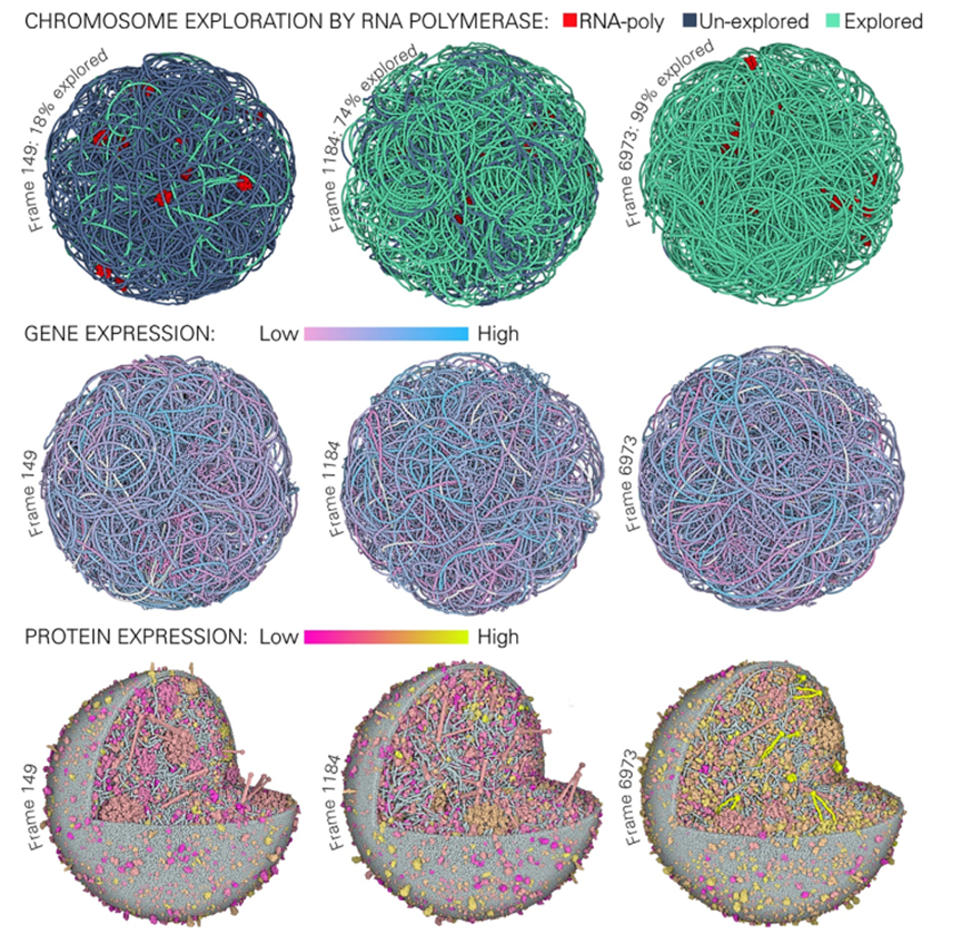 借助于全细胞模型,可以观测细胞在不同细胞周期时的结构特征,如图4展示了支原体细胞在染色质复制、基因表达和蛋白表达的三个时期的结构特点。如染色质勘探阶段,展示了模拟过程中探索的染色质结构性质:RNA聚合酶探索的区域在基因组模型上突出显示,并进行着色,显示了在选定时间点上的渐进染色体探索,基于基因表达水平的着色突出了特定时间点上高表达的基因。