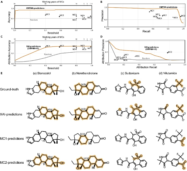 如图4所示,XAI模型在预测肝毒性的准确度上,要优于所邀请的药物学家,而药化学家对于肝毒性的预测准确度与工作年限呈正相关。在肝毒性的子结构识别方面,XAI模型的预测精度略低于一位工作经验长达20年的药化学家。研究人员也通过代表性的案例分析了药化学家与XAI模型对肝毒性子结构预测的偏向和趋势。