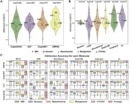 为了定量评估XAI方法在图神经网络中的可解释性,研究人员在五个基准数据集上评估了六种常用的可解释性方法与四种图神经网络的组合,如图2所示。当比较不同图神经网络的可解释性能时,CMPNN得到了最高的Attribution-AUROC值(0.671), 而 GraphNET 和GAT分别排名第2和第3。当比较不同 XAI方法时,IG方法表现最佳,得到了最高 Attribution-AUROC值为0.675,其次是 GradInput 和 GradCAM,其Attribution-AUROC值分别为0.629和0.559。可视化结果由图3展示。