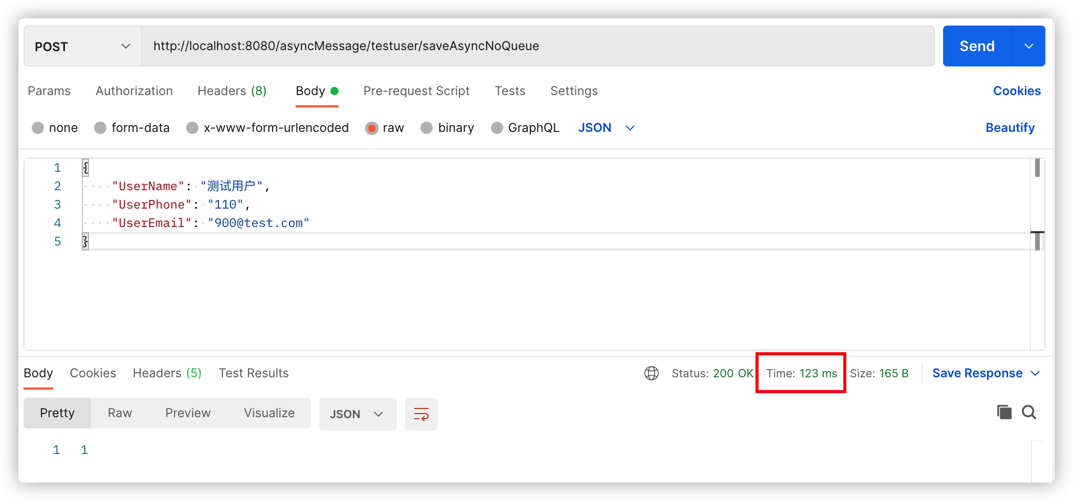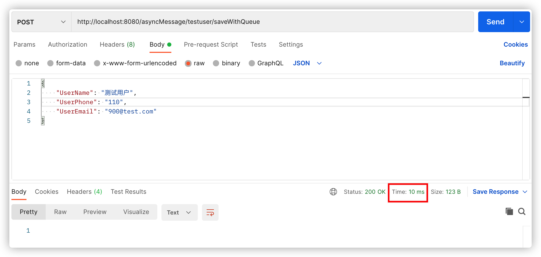 }同样用POSTMAN简单测试一下,保存用户数据后发送10000条消息,需要的时间大概为119ms,由于消息发送的业务简单,所以只相对于前文串行执行快了一点