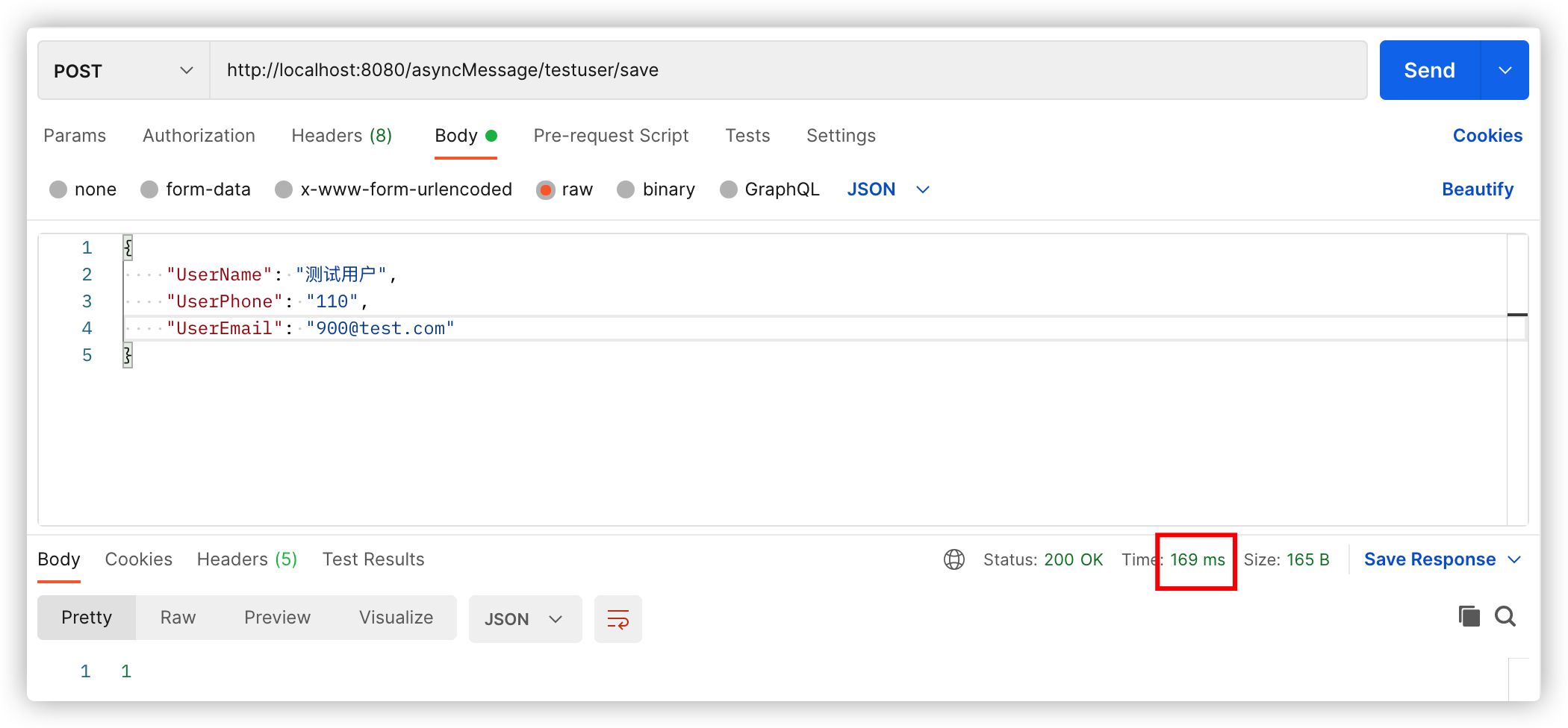 同样用POSTMAN简单测试一下,保存用户数据后发送10000条消息,需要的时间大概为10ms