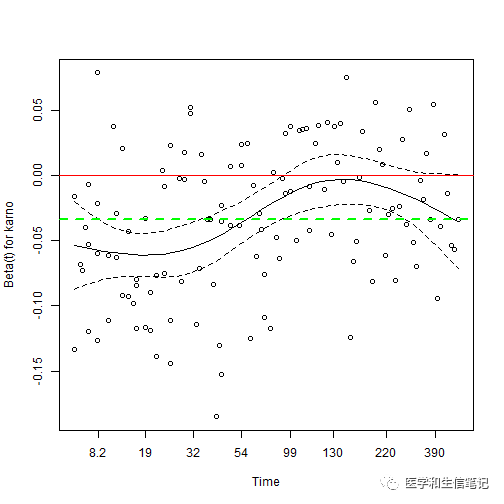 黑色实线以及两侧的虚线是karno的系数随着时间变化的曲线,绿色虚线是假设karno符合PH检验时的总体估计线,红色实线是参考线。
