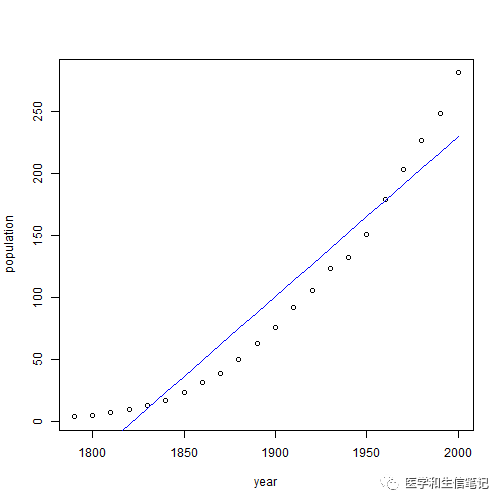 f <- lm(population ~ year, data = USPop)