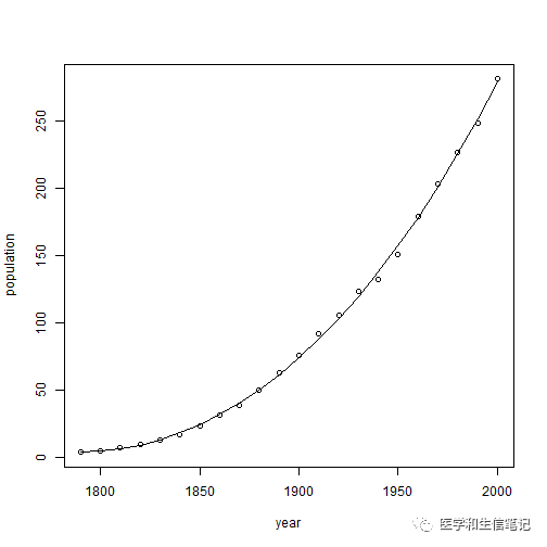 lines(USPop$year, fitted(f2))